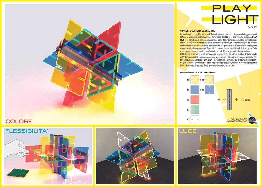 This desk lamp combines together the PMMA's lightness and the LED’s efficiency. It is formed by 18 coloured blocks of PMMA that can easily assume different positions to create the most suitable form for every house.